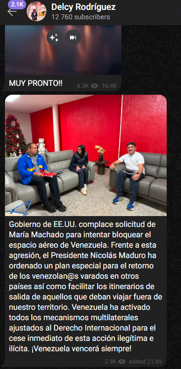 A través de un mensaje difundido en Telegram, Delcy Rodríguez aseguró: “Gobierno de EE.UU. complace solicitud de María Machado para intentar bloquear el espacio aéreo de Venezuela”, calificando el anuncio como una “agresión”.