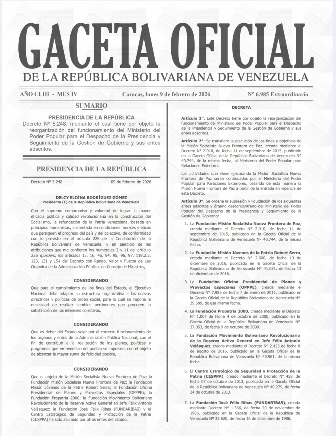 El documento oficial, fechado el lunes 9 de febrero, estableció la supresión y liquidación total de organismos que sirvieron como caja chica y aparato de propaganda durante años. Entre los descabezados figuraron la Fundación Misión Jóvenes de la Patria Robert Serra y la Oficina Presidencial de Planes y Proyectos Especiales, entes que manejaron recursos millonarios sin mayor contraloría bajo la sombra del «protector» anterior.