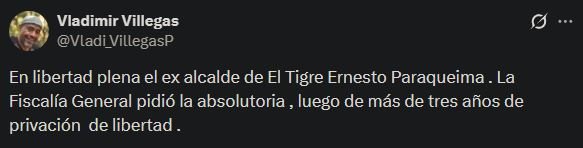 “En libertad plena el exalcalde de El Tigre Ernesto Paraqueima. La Fiscalía General pidió la absolutoria, luego de más de tres años de privación de libertad”, escribió.