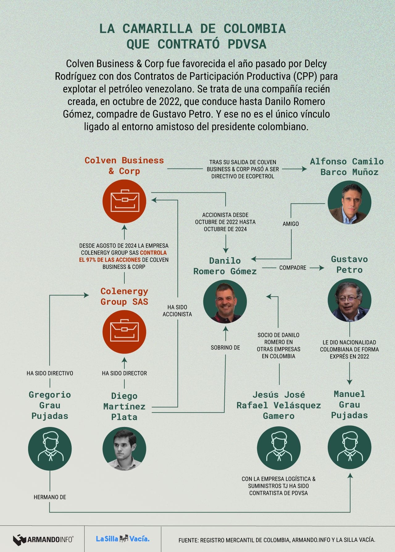 Colven Business & Corp fue registrada en Bogotá el 10 de octubre de 2022, apenas dos meses después de la llegada de Gustavo Petro al Palacio de Nariño, la sede del Poder Ejecutivo. Danilo Romero fue socio de la empresa hasta octubre de 2024, pero entre los accionistas y directivos todavía están su sobrino, Diego Martínez Plata, y el empresario venezolano Jesús José Rafael Velásquez Gamero, quien fue miembro de la junta directiva de otra empresa de Romero registrada en Colombia con el nombre de Energías & Combustibles.