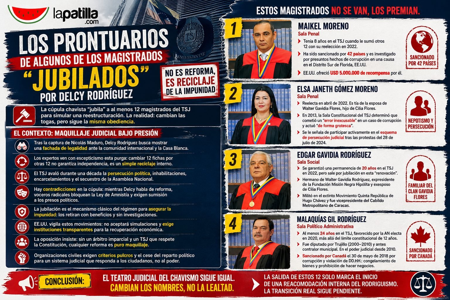 El teatro judicial del chavismo avanza sin resolver el inmenso problema de fondo. La salida de estos doce funcionarios solo marca el inicio de una reacomodación interna de las cuotas de poder del rodriguismo, dejando al país a la espera de una verdadera transición que logre desmantelar las mafias que aún controlan los tribunales venezolanos.