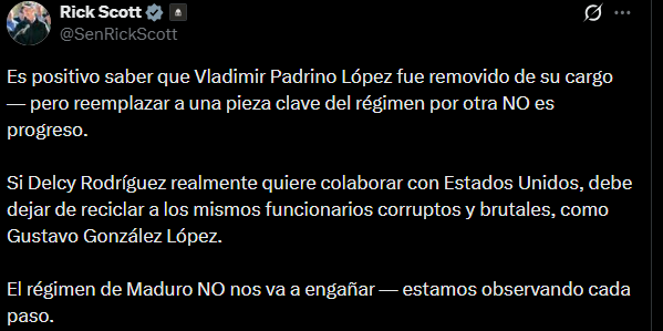 Sobre el despido del antiguo jefe del Fuerte Tiuna, Scott reconoció que «es positivo saber que Vladimir Padrino López fue removido de su cargo», pero alertó que el movimiento no representa una ruptura real con el esquema anterior. El senador fue enfático al declarar que «reemplazar a una pieza clave del régimen por otra NO es progreso».